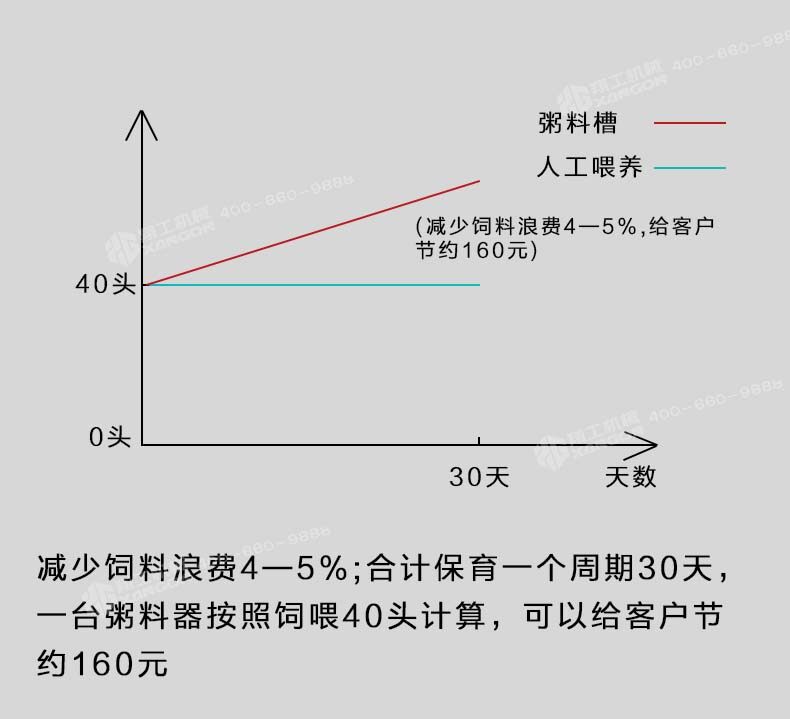 即便按照三個好處累加保育一次可以節(jié)約560元,一年按照使用粥料器保育6—8窩仔豬,累加一臺粥料器智能豬料槽通過在豬場的試驗得出驗證,解決了飼料轉(zhuǎn)化率,豬通過食料相比之前的飼喂每天多增重0.4斤,減少和杜絕了胃腸道病的發(fā)生幾率。合理采食的同時減少了飼料的浪費,省料即是省錢,普通的飼喂飼料浪費率在5%-10%,豬場中使用了粥料器后飼料浪費率控制在2%左右。減少人員的勞動強度,夜晚無法定量投喂的問題。