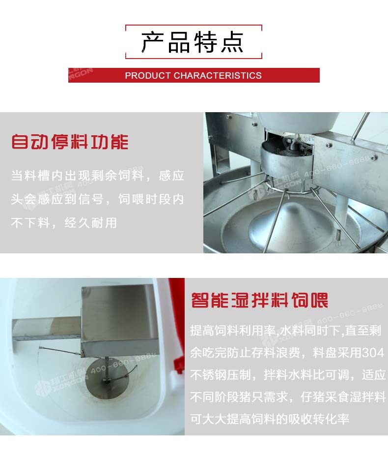 智能豬料槽詳細介紹: 1.該設(shè)備全部采用不銹鋼制作,堅固耐用。減少污染。 2.外形尺寸131cmX66cmX63cm,料桶采用好的原包料制作,容量60kg。 3.有自動停料功能,當料槽內(nèi)出現(xiàn)剩余飼料,感應頭會感應到信號,飼喂時段內(nèi)不下料,直到剩余飼料被小豬吃完,防止料槽內(nèi)存料過多造成浪費。料盤采用304不銹鋼整體壓制,經(jīng)久耐用。