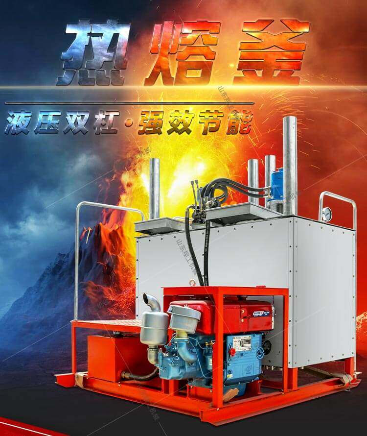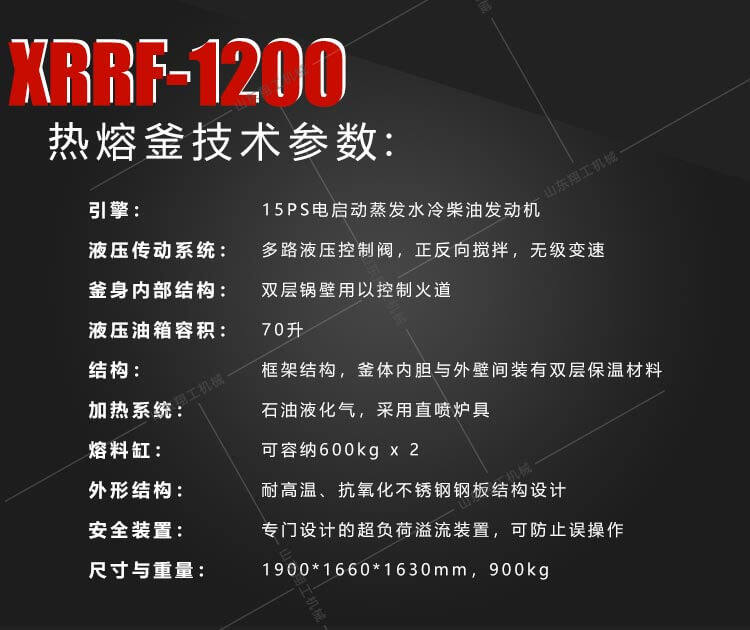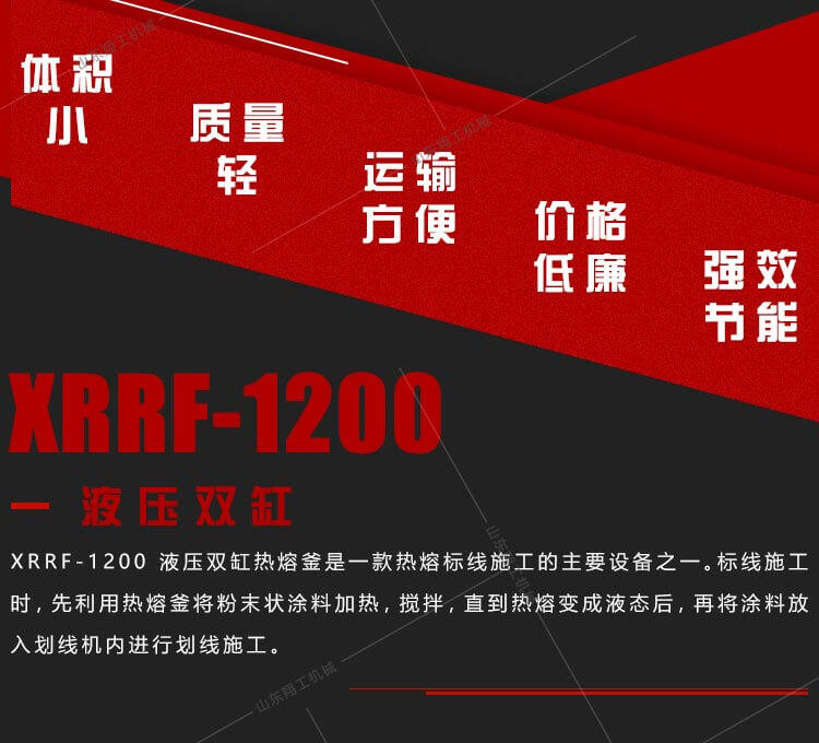 XG1200液壓雙缸熱熔釜是一款熱熔標(biāo)線施工的主要設(shè)備之一。標(biāo)線施工時(shí),先利用熱熔釜將粉末狀涂料加熱,攪拌,直到熱熔變成液態(tài)后,再將涂料放入劃線機(jī)內(nèi)進(jìn)行劃線施工。