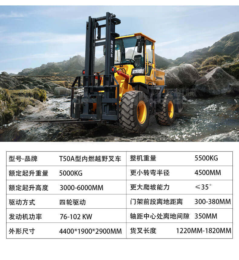 5.越野叉車發(fā)動機功率大,采用全輪驅動和越野輪胎。