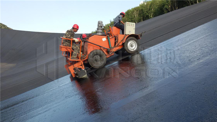 涂刷前,首先用水清洗防滲層表面,待表面干燥后噴涂一層乳化瀝青,對于表面被污染處處的防滲層表面噴灑一薄層乳化瀝青或稀釋瀝青涂刷。待乳化瀝青充分破乳干燥后進行封閉層涂刷。涂刷機自帶導熱油加熱裝置,對料斗里的混合料能夠起到保溫作用。涂刷條幅尺寸為2.2m寬×88m(最大條幅長度108m)長,涂刷機的涂刷上行速度為6m/min。在涂刷機后,安排人工對流掛部位進行刮抹找平處理。個別漏涂的部位,待涂刷層不粘時由人工補刷。涂刷偏厚部位,則由人工局部加熱刮薄處理。